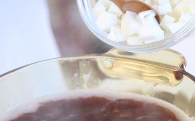 第三步:之後我們先把芋頭去皮,切成小丁;等待紅豆煮得差不多的時候,開蓋把芋頭丁和冰糖倒入鍋中,適當攪拌至冰糖完全融化後,蓋上蓋小火繼續慢燉25分鐘就可以出鍋品嘗瞭。