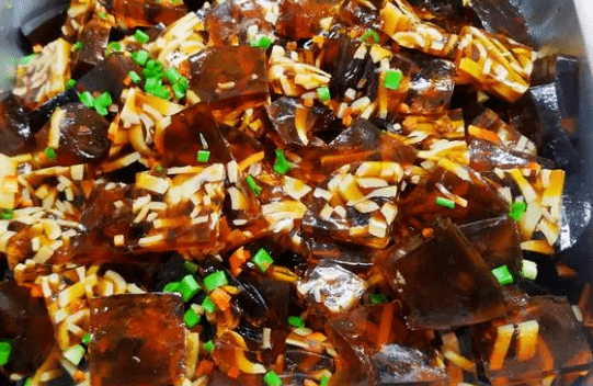 這種菜的獨特性在於其做法和口感,可以說非常特別。將豬皮和豬血加工後切成塊狀,再放入冰箱降溫制成凍狀。口感嫩滑,因為肉皮的韌性,有些水果的口感,與豬血的味道相得益彰。