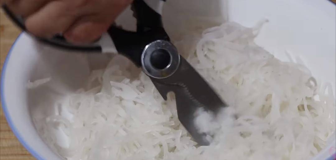7:蘿卜絲醃好後,擠出多餘水分,放到空碗中,用剪刀稍微剪斷一些。