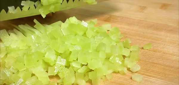 6:再準備一小段萵筍,削去外皮,先切成片,再切成小碎丁,放盤裡備用。