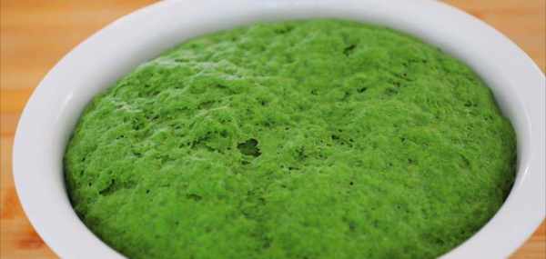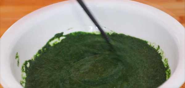 4:將菠菜倒進榨汁機中,榨成深綠色的汁水,倒在大一點的碗中。