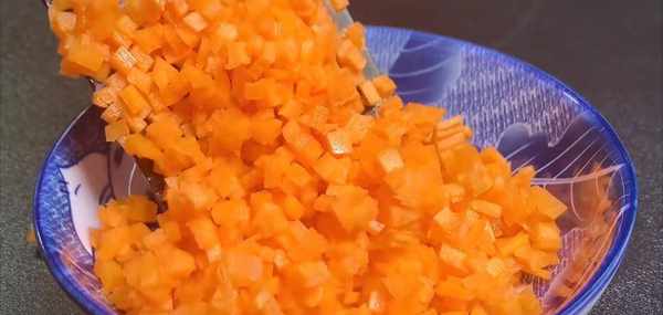 5:準備半節胡蘿卜,先削皮再切成片,最後切成小碎丁,放盤裡備用。