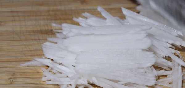 1:白蘿卜削去外皮,先切成薄片,再改刀切成細絲(可以借助工具操作)。