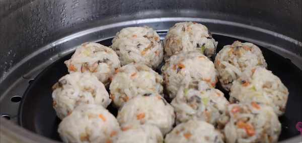 10:丸子全部放盤裡,再拿到蒸屜中,冷水下鍋,開大火煮15分鐘。