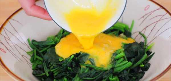 3:準備2個雞蛋,打入空碗中,攪拌均勻,再倒進菠菜中,攪拌幾下。