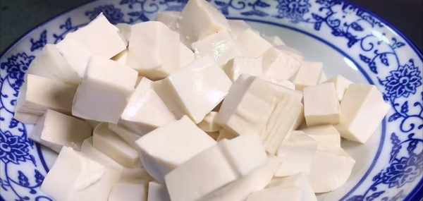1:準備1塊豆腐,先切成厚片,再改刀切成小方塊,裝入盤子備用。