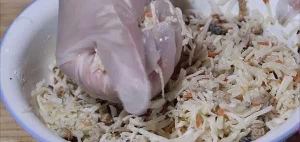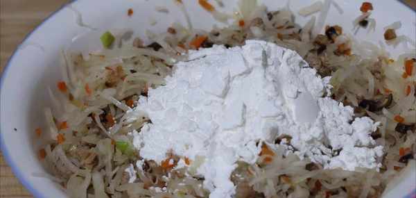 8:放入炒好的配菜,充分攪拌均勻,再加土豆淀粉,繼續攪拌均勻。
