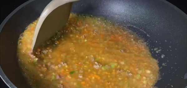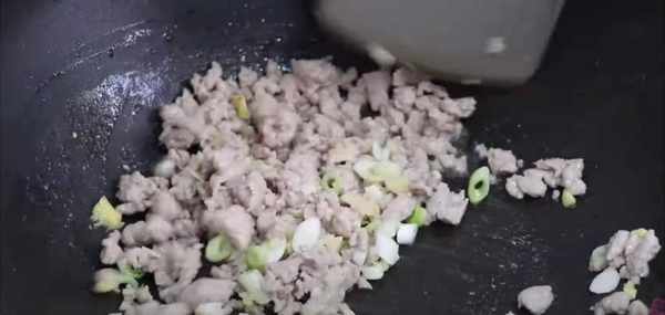 5:起鍋燒油,下入肉末炒散炒香,再下入蔥薑蒜爆香,翻炒幾下。