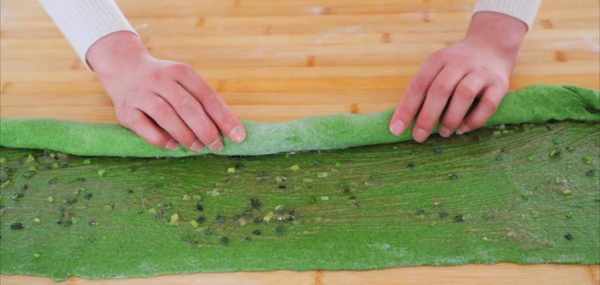 8:面發好後,搟成長方形面皮,塗抹上一層油酥,從另一邊卷成卷。