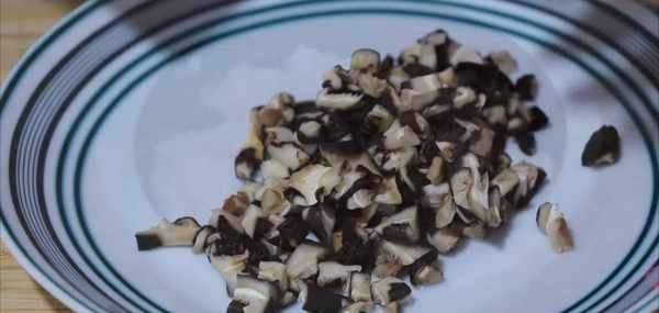 3:香菇清洗幹凈,用刀切成條,再切成小粒,放盤子中備用。