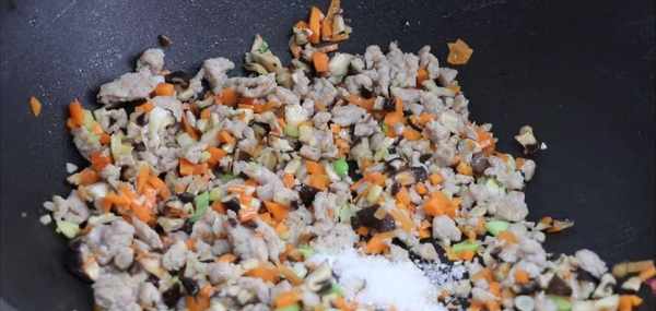 6:接著放入胡蘿卜丁、香菇丁,翻炒均勻,炒至斷生,撒點食鹽調味即可。