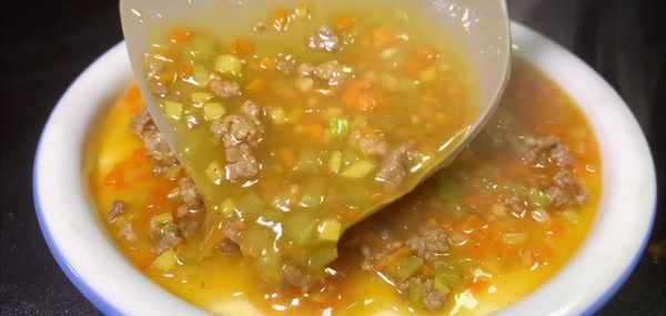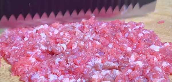 7:準備3塊錢牛肉,切片後剁成肉末,盡可能剁得更細膩一些。