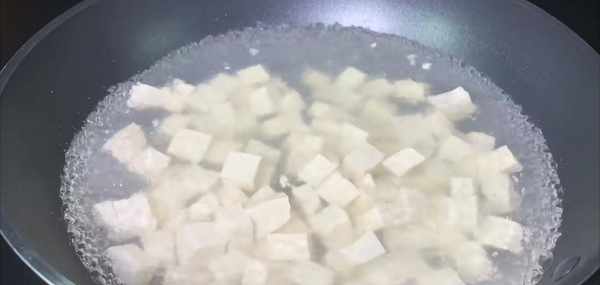 3:鍋中水開後,撒入1勺食鹽,下入豆腐丁,焯水1分鐘,即可撈出來。