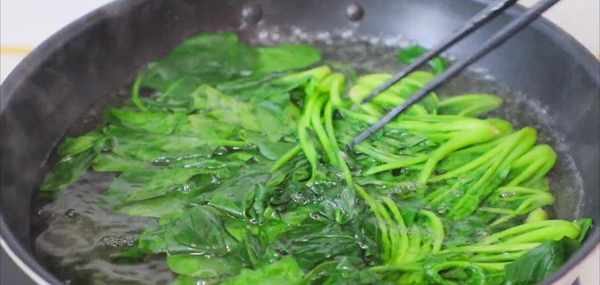 1:菠菜先洗凈,再下入鍋中,焯水1分鐘,撈出放盤裡晾涼。