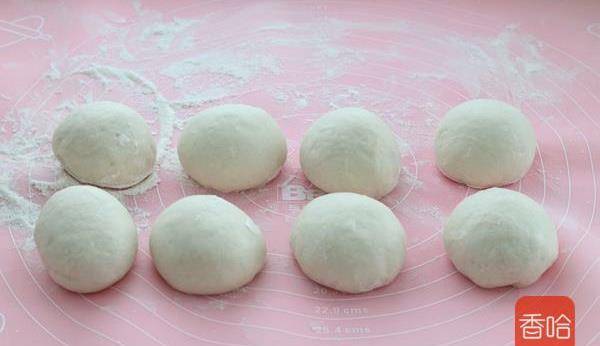 6.取出面團揉勻排氣,分割成均勻的8-10份,揉圓後表面覆蓋保鮮膜靜置15分鐘。