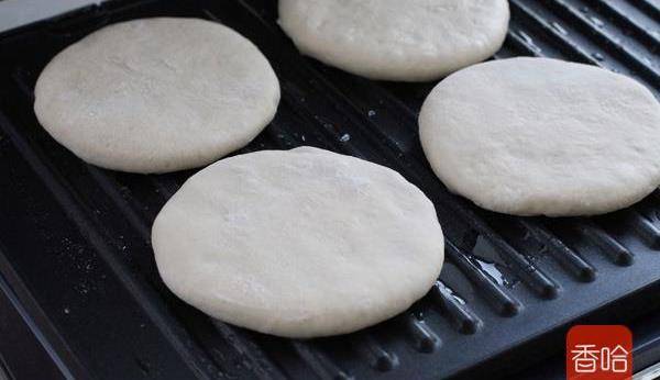 8.電餅鐺刷一層薄油燒熱,放入餅胚小火烙制。我用的是牛排機,成品自帶花紋還挺漂亮的。