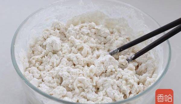 3.分少量多次的加入清水,一邊加一邊用筷子攪拌成棉絮狀。