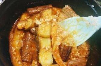 8加入魚香茄子醬和鎮江香醋兜炒。