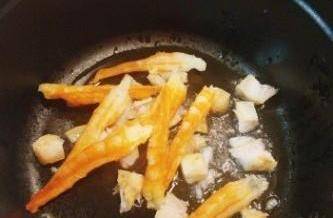 4燒熱油爆香蝦幹和咸魚。(整個廚房都彌漫著一股很香的味道)