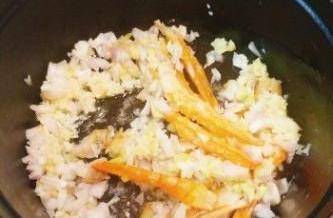 5加入薑粒、幹蔥粒和蒜蓉炒香。