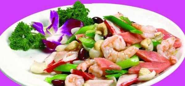 蝦仁100克,蟹柳50克,火腿50克,紅腰豆50克,蘆筍100克,蒜薑片5克。雞粉2克,鹽適量。