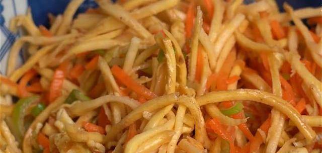 4.趁發酵的時候炒個餡。紅薯洗幹凈去皮,用擦絲器擦成絲;胡蘿卜也擦成絲。加入一勺鹽殺出裡面的水分,大概醃制十分鐘左右。