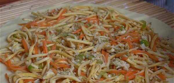 12.在面上鋪上一張面片,把剩下的餡料鋪均勻即可。