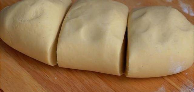 9.案板上撒點幹面粉,發好的面團移過來,揉搓排氣。然後搓長,分成三等分。