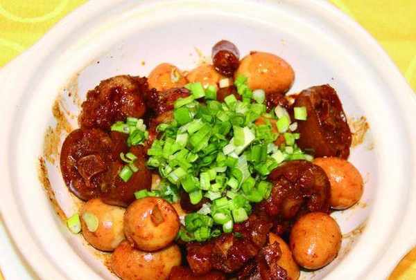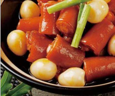 備料:豬尾巴,鵪鶉蛋,薑,蔥,冰糖,八角,香葉,桂皮,幹紅辣椒,料酒,生抽,老抽,精鹽