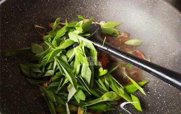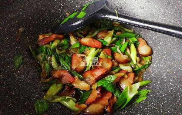 5.蒜苗再放入跟臘肉片一起翻炒,炒制斷生即可