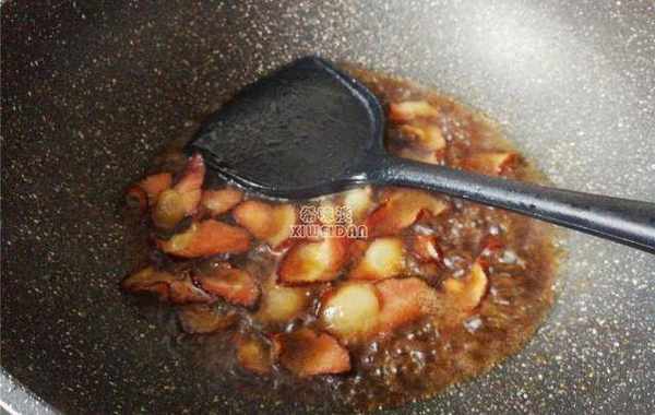 3.臘肉炒制微黃,倒入點料酒翻炒,撒入點白砂糖