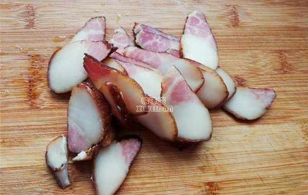 1.首先把煙熏臘肉用淘米水清洗掉煙熏黑,再浸泡個把小時後,切片炒菜