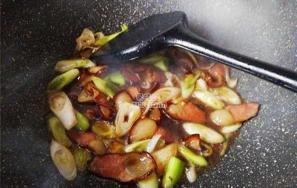 4.倒入點清水把臘肉煮制沸騰會,先把蒜白部分放入翻炒變軟
