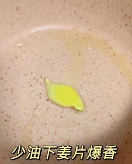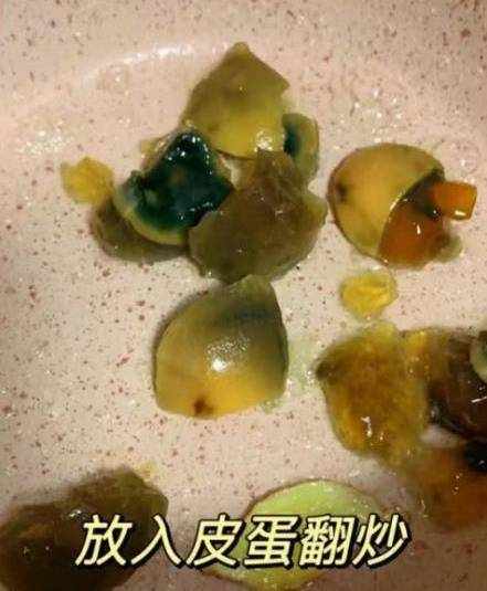 3:鍋底刷上少許橄欖油,放入一些生薑片,倒入皮蛋煸炒30秒左右,將蛋液煎至微微焦黃。