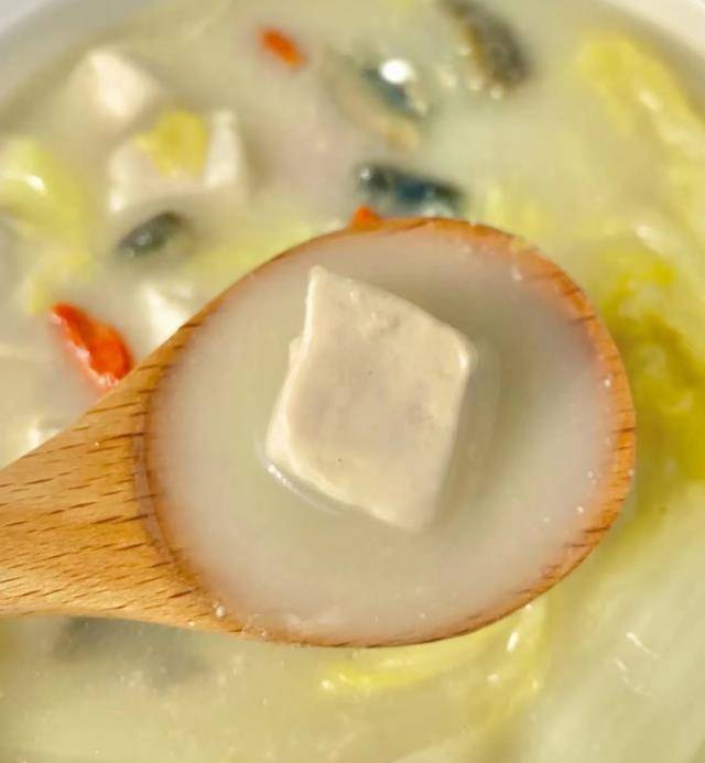 4:調入幾大碗開水,大火將其煮沸,放入若幹豆腐塊,加上一勺豬油(這樣豆腐湯更鮮美),豆腐湯煮至乳白色,放入一些娃娃菜燙熟。