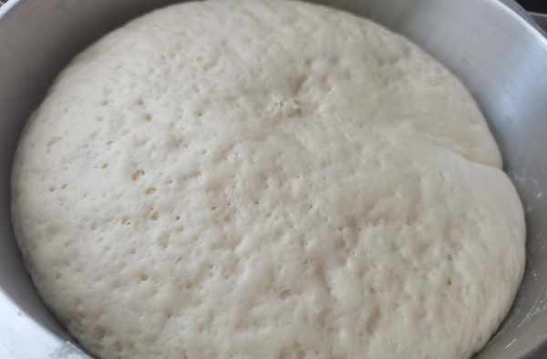 3.把面團放到帶蓋子的容器中,發酵到表面有許多氣孔這樣的狀態。
