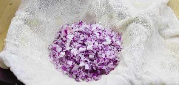洋蔥切成小丁,切好的洋蔥丁直接放在紗佈裡擠幹水分,準備10塊錢的豬裡脊先切片,最後切成丁,準備一小塊生薑。先切成末,備用。水分燒幹以後,多加一點食用油,把肉末炒一下。炒至肉末變色,加入薑末,翻炒出薑末的香味以後,開始調一下味,加入料酒,多加一點生抽,少來一點老抽上色。最後來蠔油。肉末直接放到洋蔥丁裡,然後加入5克鹽調味,下成大小相等的劑子。小劑子切好以後,搟成邊緣薄,中間厚的薄面片。