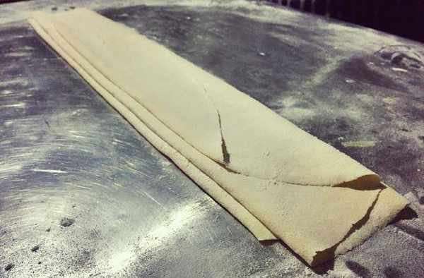 6.搟好的面皮一層一層疊放整齊,疊下一層時要註意留兩厘米的距離這樣切得面會更好看。