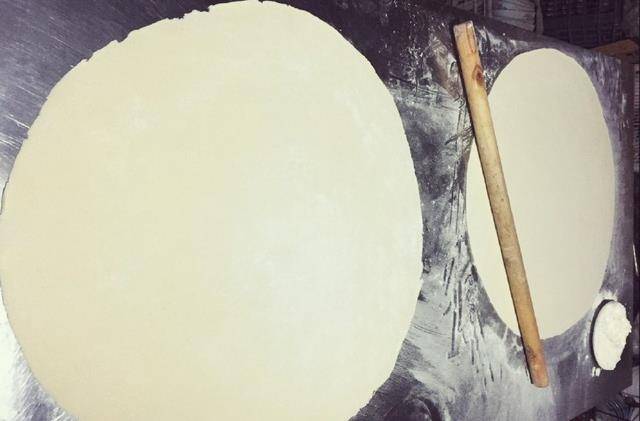 5.將面團搟成薄面皮,搟面皮時要及時撒面粉塗均勻防止面粘在一起。