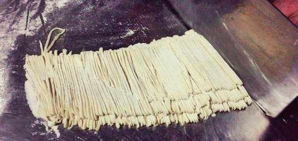 7.將疊好的面用刀切成面條喜歡吃粗的可以切粗一點。