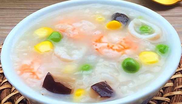 等到米粒開花後,放入生薑,香菇丁,玉米粒,豌豆,蓋上蓋子繼續煮,待粥粘稠後放入蝦仁和魷魚圈,大火煮至沸騰後,加入適量的白胡椒粉和食鹽調味,出鍋即可。
