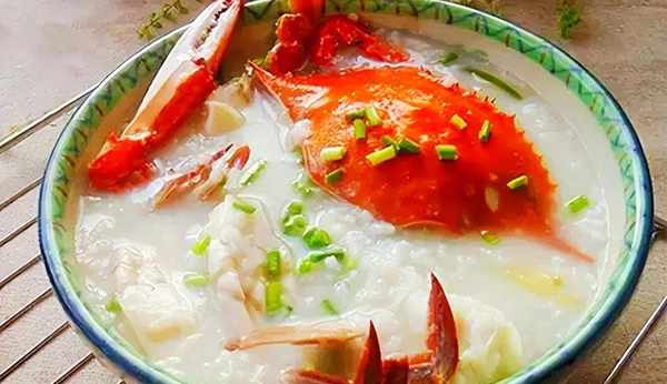 準備砂鍋,放入大米和水,煮到大米粘稠後,放入薑絲和海蟹,再煮6分鐘,加入食鹽,雞精和白胡椒粉調味,最後撒上蔥花即可出鍋啦。