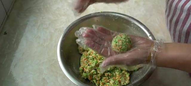 大約一分鐘撈出來沖一下涼水。準備適量的豬肉剁成肉餡,最好是帶點顆粒感,口感更好,裡面放入蔥花薑末,一小勺花椒粉,料酒、生抽、適量的鹽,一勺食用油,朝一個方向攪拌,攪到肉餡能拉絲的狀態。打入一個雞蛋,加一勺淀粉攪拌均勻,放一邊醃制10分鐘。焯水後的苦瓜切成條,再切成小丁。一根洗凈的胡蘿卜切成小碎丁。裡面加點鹽、胡椒粉,攪勻以後加入一大勺淀粉,然後再分次加入面粉,用手輕輕地抓幾下,鉆出苦瓜和胡蘿卜的水分,不需要額外再加水加面粉的量,