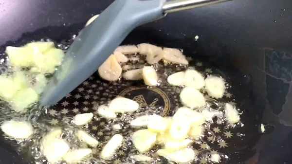 7.另起鍋,放少許的食用油,油熱後再把蒜片放進鍋中.