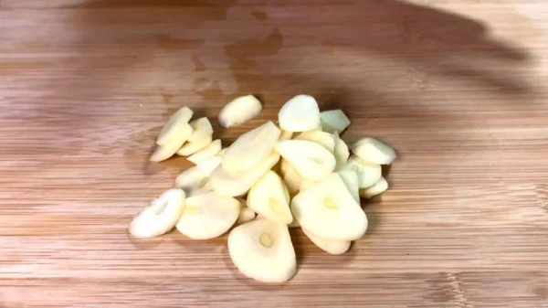 3.一頭大蒜,還是去年在老傢拿的,現在都還沒吃完,多加一些,剝去外皮,放在案板上,用我祖傳的大刀,給它切成薄薄的厚片,把大蒜全部切好裝進碗中備用。