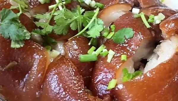 6.在電飯鍋裡用煮飯鍵一共煮瞭3個小時,這個時候的肉已經很軟爛瞭,顏色也非常的紅潤,把它裝入到盤中,在上面放點蔥花和香菜,美味即成。油而不膩,非常的好吃。