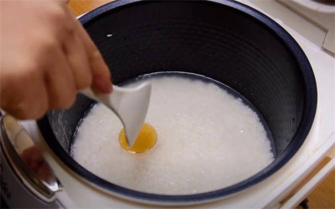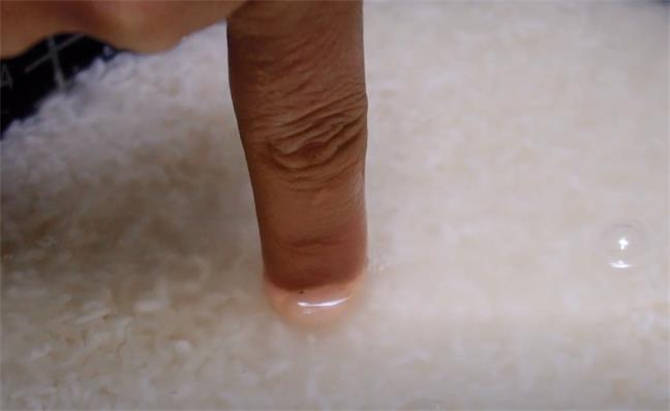 2.放在電飯鍋裡面,把米鋪平,倒一些清水進去,這個水沒過這個米一個指節就行瞭。