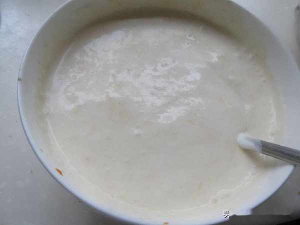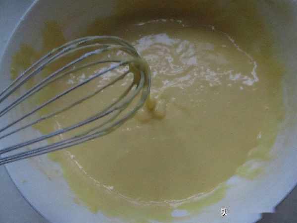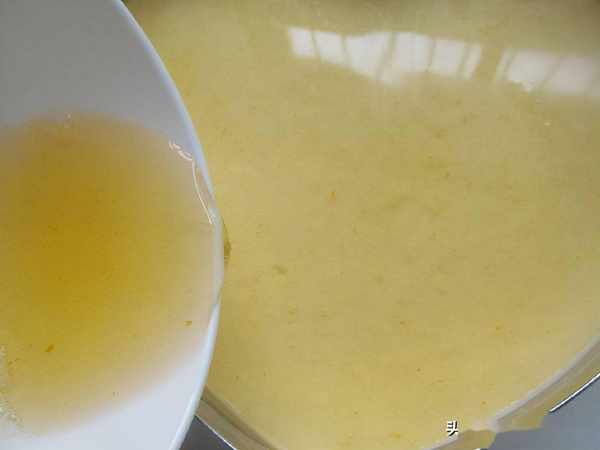 2,把蛋黃沙棘汁和葵花籽油一起攪拌均勻,篩入麵粉拌勻,成蛋黃糊。