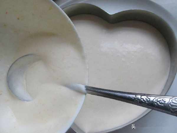 9,把慕斯糊倒入慕斯圈中的蛋糕上面。