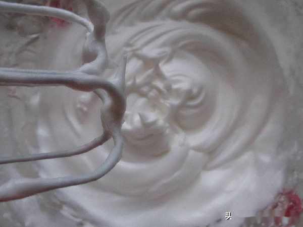 3,把蛋清加白糖打成幹性發泡成蛋白霜。